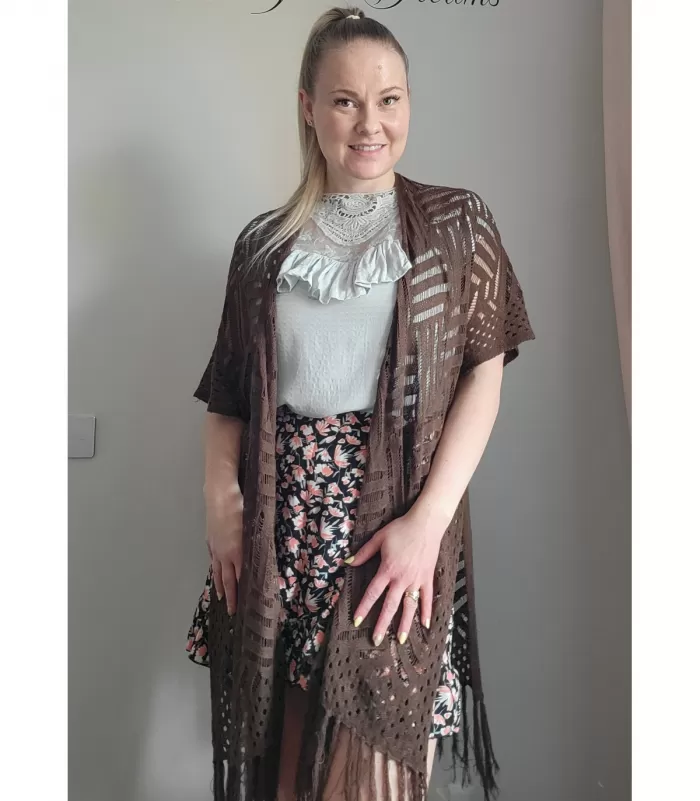 Tummanruskea virkattu kimono hapsukoristeilla. Upea hapsukoristeinen kimono on täydellinen erilaisiin asukokonaisuuksiin. Ihana hapsukoristeinen virkattu kimono on loistava esimerkiksi festareille sekä erilaisiin kesätyyleihin. Kevyt vaate sopii loistavasti myös rantatyyliin bikinien tai uima-asun suojaksi. Rypistymätön, monikäyttöinen vaate on oiva valinta matkalaukkuun mukaan. Suosittu kimono on saatavilla kolmessa värissä. Avonainen vaate väljillä hihoilla sopii myös isommille naisille. Tummanruskea kimono on helppo yhdistää eri väreihin ja moniin tyyleihin.