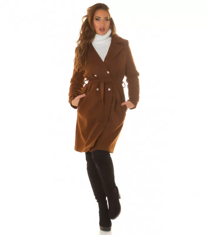 Elegantti ruskea pitkä trenssitakki vyöllä ja koristeilla - kevyt ajaton takki syksyyn ja kevääseen