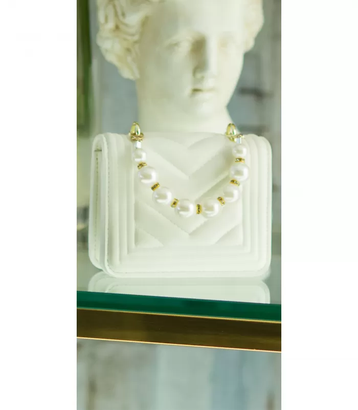 Valkoinen super pieni käsilaukku helmikahvalla ja pitkällä irrotettavalla kullanvärisellä ketjulla.