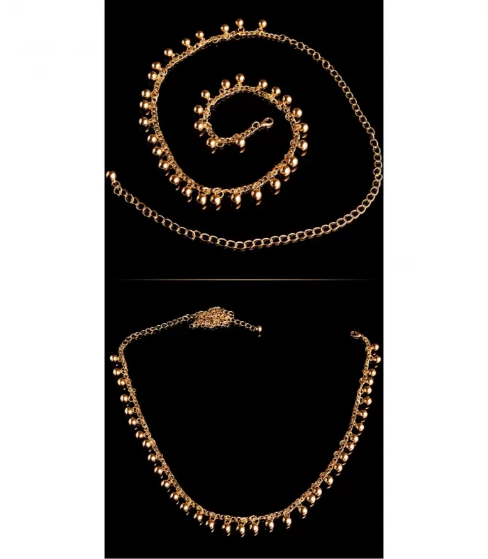 Kultainen metallipallokoristeinen ketjuvyö.