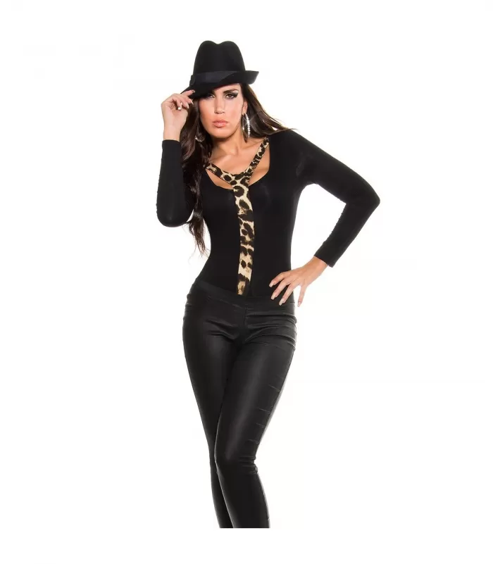 Musta/leopardikuvioinen pitkähihainen kaksivärinen avoselkäinen henkselibody. Yhdistä housujen tai hameen kanssa! Saatavilla vain tämä erä - emme saa tuotetta näillä näkymin lisää.
