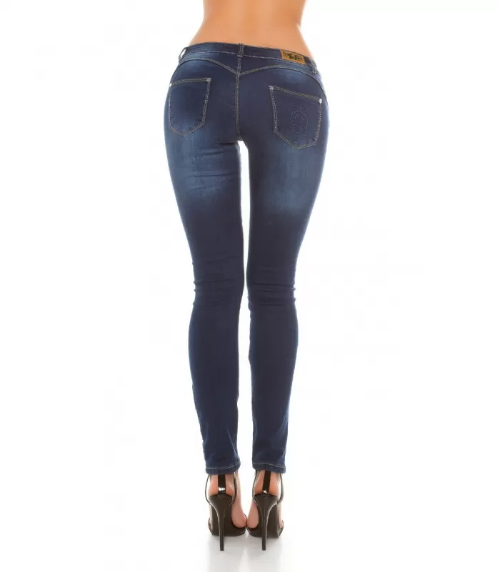 Siniset hopeastrassi- ja pitsikoristeiset farkut takapuolta korostavalla leikkauksella. Farkuissa ei ole toppauksia.