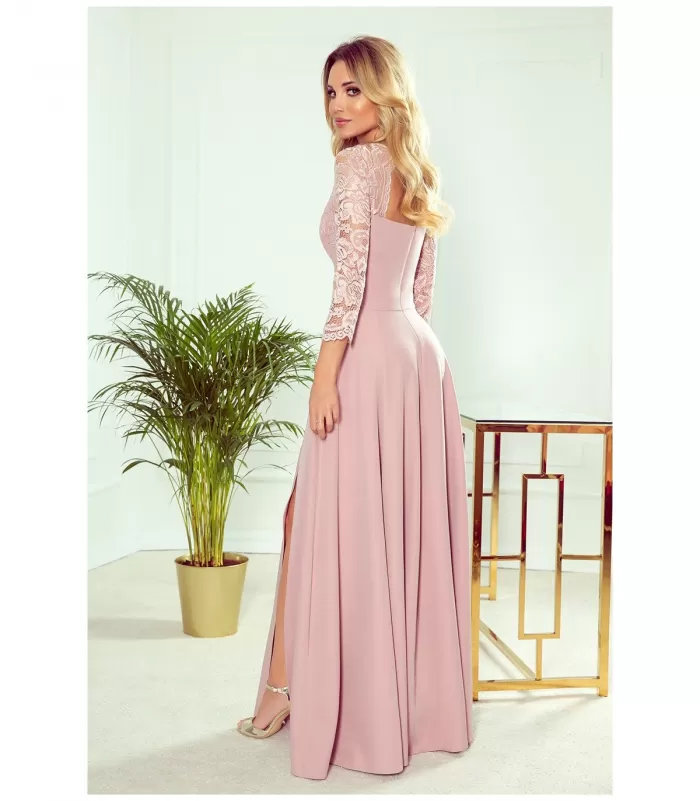 Vaaleanpunainen 3/4-hihainen pitsikoristeinen pitkä v-juhlamekko halkiolla. Mekko valmistettu Puolassa. Malli kuvassa 170cm ja käyttää kokoa S. Saatavilla vain tämä erä.