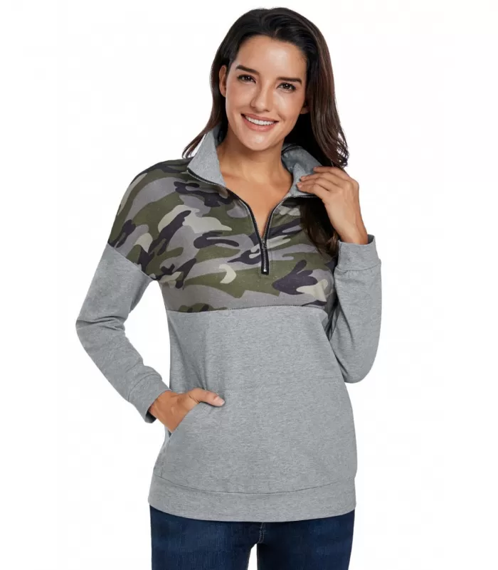 Harmaa maastokuvioinen pitkähihainen vetoketjukoristeinen collegepaita vatsataskulla. Saatavilla vain tämä erä - emme saa tuotetta enää lisää.