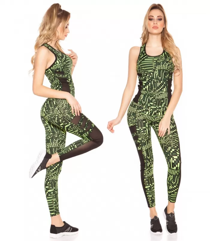 Keltaiset printtikuvioiset mesh-koristeiset treenitrikoot ja yhteensopiva treenitoppi. Käytä yhdessä tai erikseen!