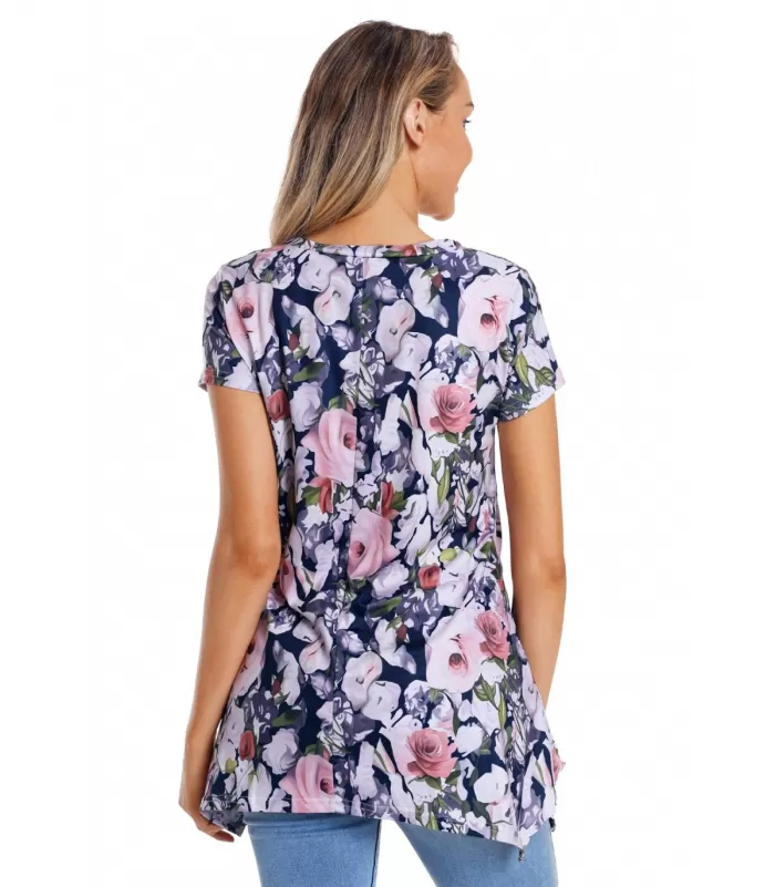 Kukkakuvioinen lyhythihainen epäsymmetrinen väljä paita. Saatavilla vain tämä erä - emme saa tuotetta näillä näkymin enää lisää.