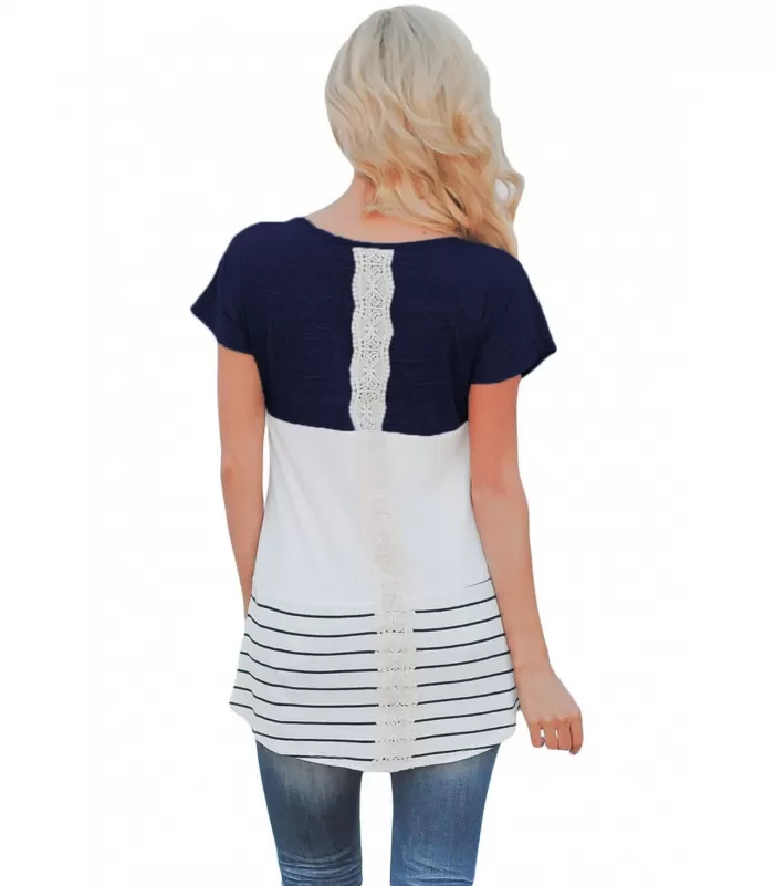 Sinivalkoinen lyhythihainen pitsikoristeinen paita raidoilla. Saatavilla vain tämä erä - emme saa tuotetta enää lisää.