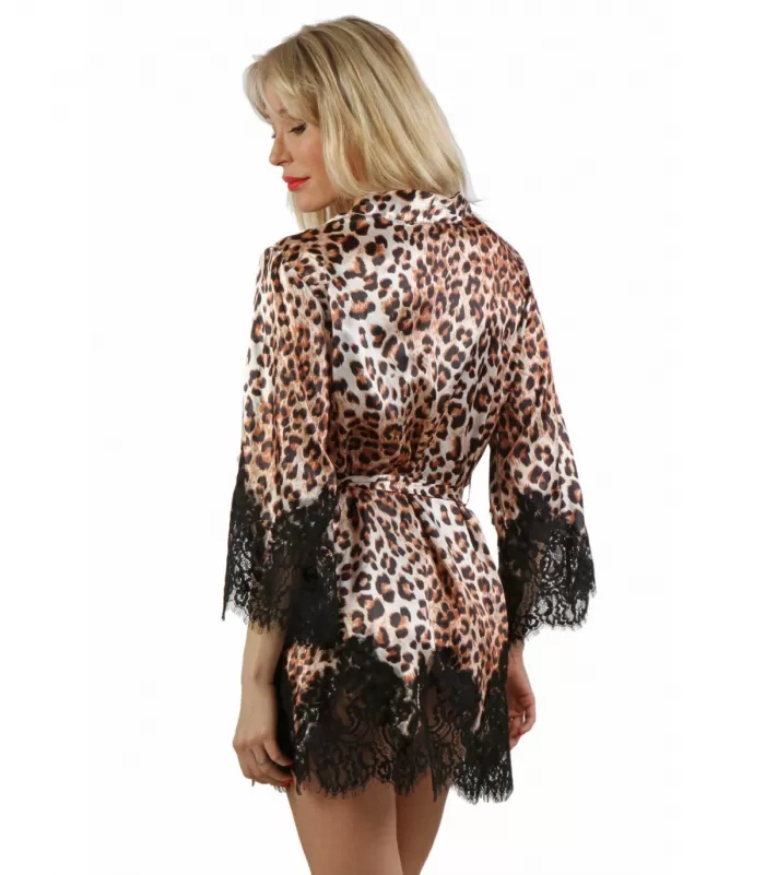 Viettelevä lyhyt leopardikuvioinen aamutakki pitsillä, vyöllä ja vyölenkeillä. Täydellinen valinta täydentämään alusasutyylisi. Seksikäs leopardikuosi on aina hot.