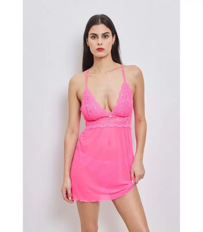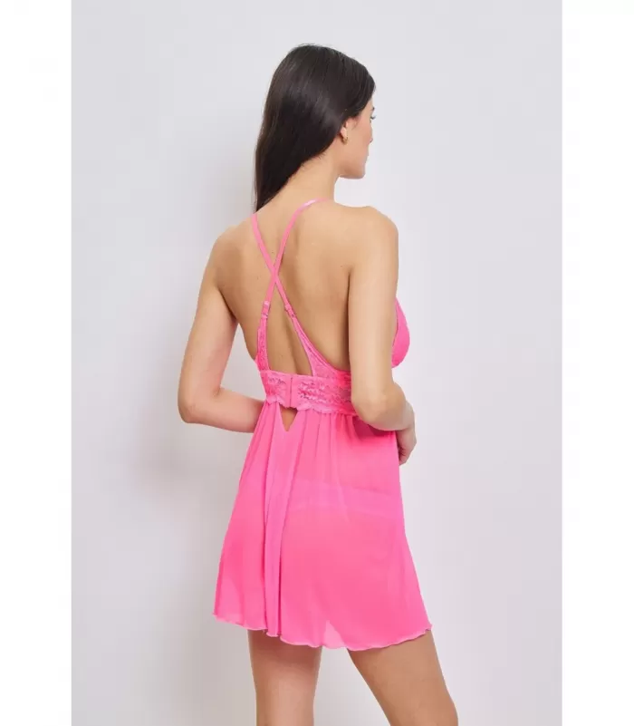 Ihastuttava neonvaaleanpunainen pitsikoristeinen babydoll ristikkäisolkamilla. Kaaritueton ja toppaamaton malli sopii monille ja tekee asusta mukavan nukkua. Säädettävät olkaimet auttavat täydellisessä istuvuudessa. Täydellinen valinta, kun haussasi on kaunis yöasu, jossa näytät upealta ja tuntuu mukavalta päällä. Tämä pirteän värinen babydoll on must-have hankinta kaikille, joiden suosikkiväri on pinkki/vaaleanpunainen.