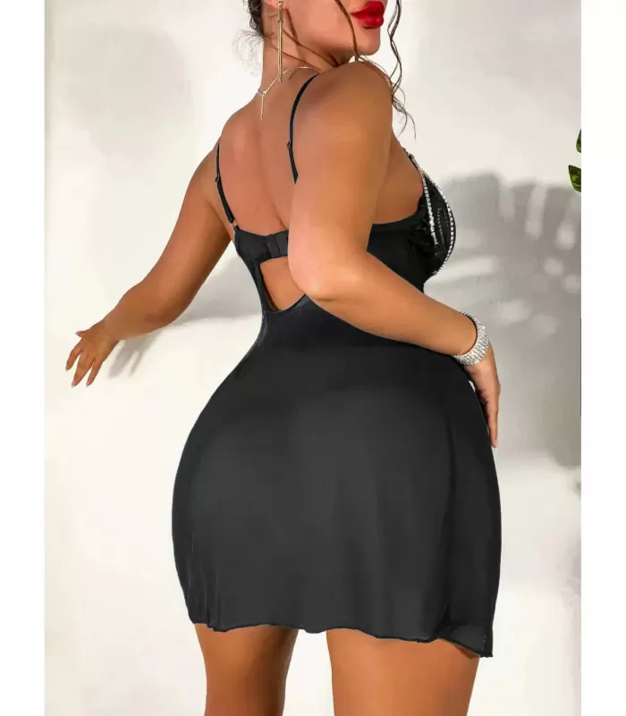 Seksikäs musta babydoll upeilla yksityiskohdilla. Kaarituetut pitsikupit strassiketjuilla sopivat parhaiten noin B-C -kupille. Säädettävät olkaimet ja takana tuplahakaskiinnitys kolmella säätövaihtoehdolla varmistavat hyvän istuvuuden. Läpikuultava pitsi ja mesh-kangas paljastavat ja peittävät juuri sopivasti. Tuotteelle suositellaan käsipesua.