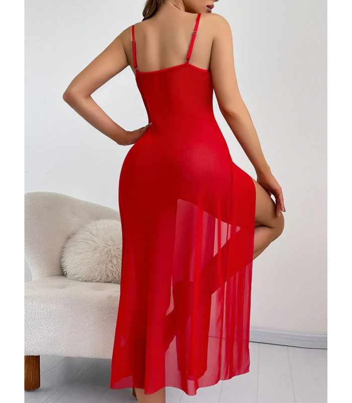 Punainen pitkä babydoll pitsillä ja kukkakoristeilla. Korkeat halkiot tuovat asuun lisää seksikkyyttä ja käyttömukavuutta. Säädettävät olkaimet, joissa solmittavat nauhakoristeet. Kauniit helmikoristeiset kukkakoristeet viimeistelevät asun.