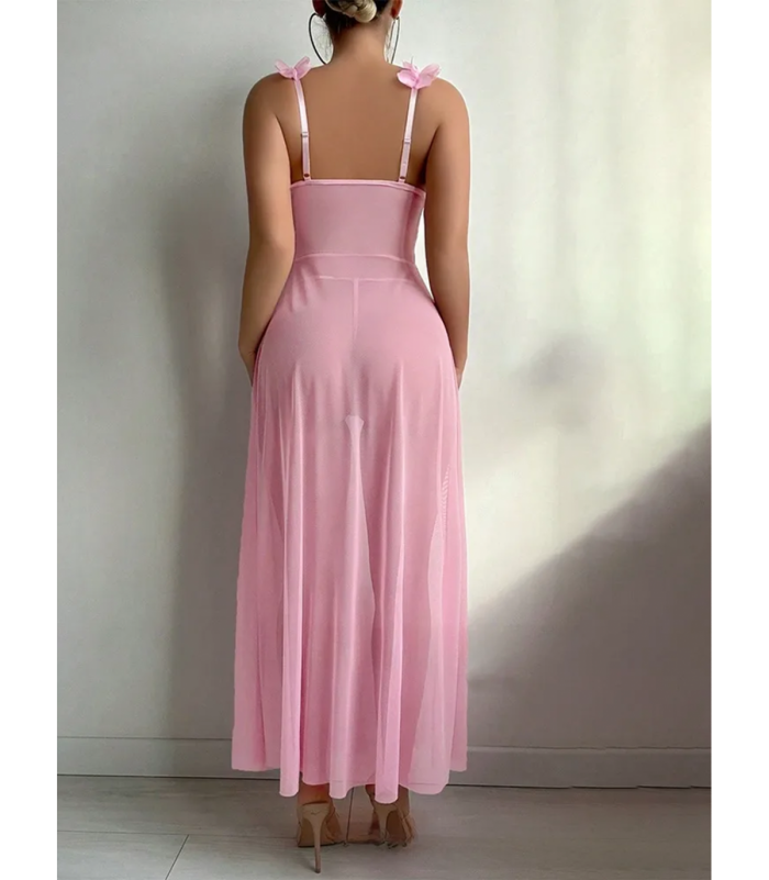 Seksikäs vaaleanpunainen pitkä avonainen babydoll kauniilla yksityiskohdilla ja yhteensopivat stringit. Kaaritueton alusasu sopii monille. Säädettävät olkaimet varmistavat hyvän istuvuuden. Edessä pujotuskiinnitys. Läpikuultava pitsi ja mesh-kangas paljastavat ja peittävät juuri sopivasti.