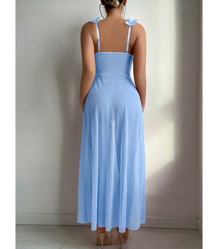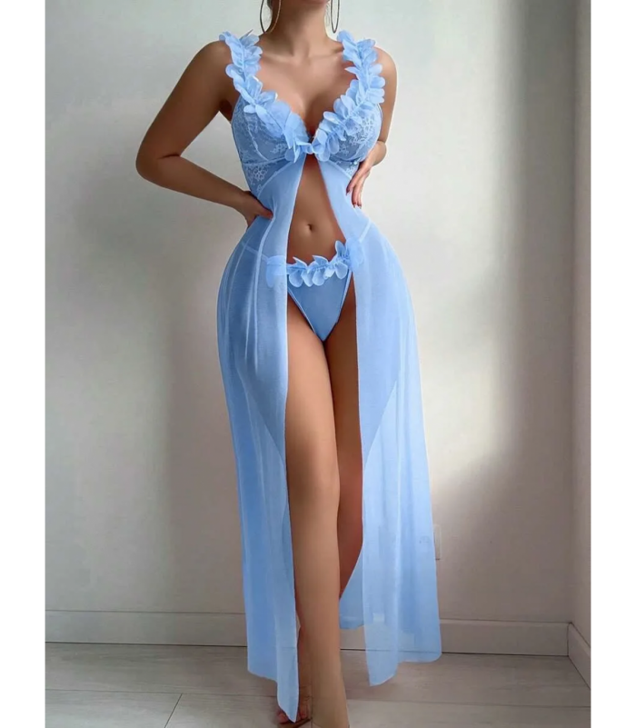 Seksikäs vaaleansininen pitkä avonainen babydoll kauniilla yksityiskohdilla ja yhteensopivat stringit. Kaaritueton alusasu sopii monille. Säädettävät olkaimet varmistavat hyvän istuvuuden. Edessä pujotuskiinnitys. Läpikuultava pitsi ja mesh-kangas paljastavat ja peittävät juuri sopivasti.