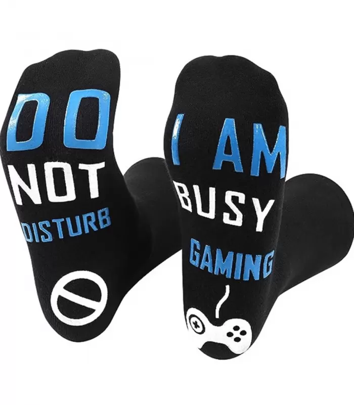 Mustat sukat "Do not disturb, I am busy gaming" -tekstillä. Hauskat sukat ovat edullinen lahjaidea läheiselle.