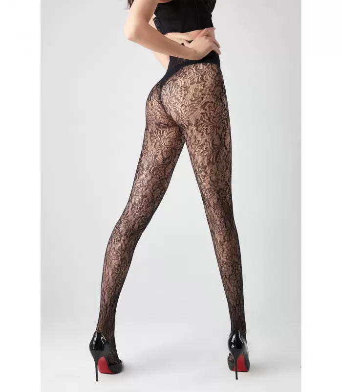 Korkeavyötäröiset mustat pitsikoristeiset sukkahousut. Kauniisti kuvioidut mustat verkkosukkahousut viimeistelevät naisellisen asukokonaisuuden.