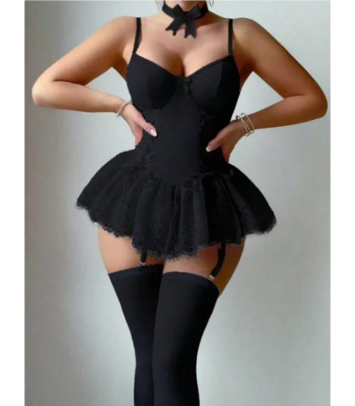 Viettelevän kaunis musta alusasu pitsillä, nyöreillä ja ruseteilla. Etupuolella säädettävät sukkanauhaliivit (sukat eivät sisälly tuotteeseen). Säädettävät olkaimet varmistavat hyvän istuvuuden. Takana tuplahakaskiinnitys kolmella säätövaihtoehdolla. Nyörit tuovat sekä seksikkyyttä asuun että tarjoavat pienen säätömahdollisuuden vyötäröosan istuvuuteen. Mukana choker kaulanauha rusetilla. Chokerissa takana metallinen pujotuskiinnitys.