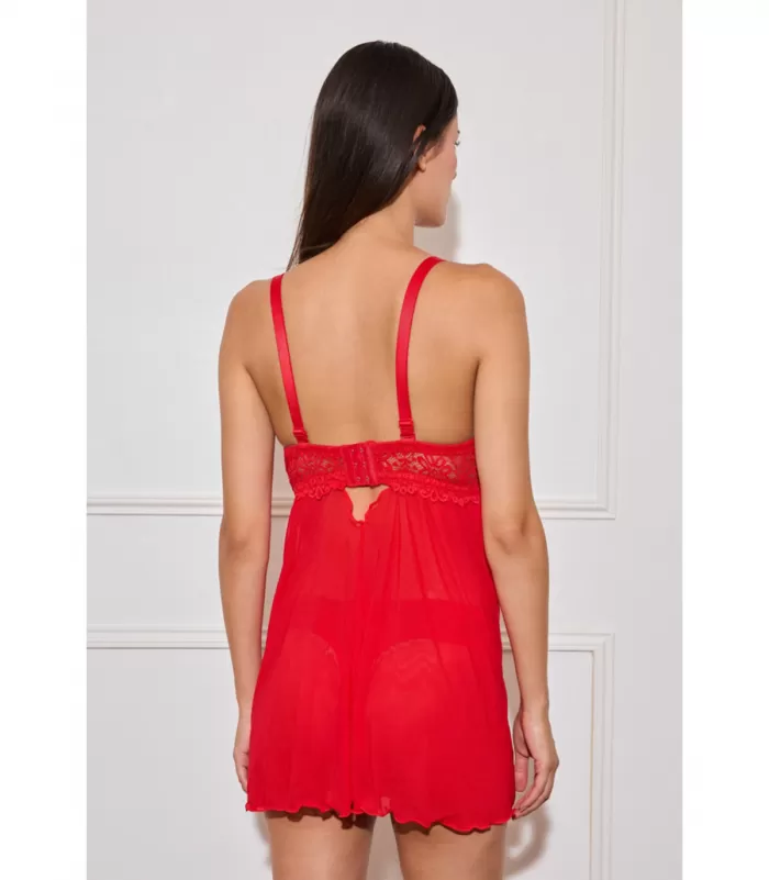 Sensuelli punainen babydoll pitsikoristeilla. Kevyesti topatut kaarituetut kupit sopivat parhaiten rintaville, noin D-E-kupille. Jos mietit kahden koon välillä ota pienempi koko, jos olet pienirintaisempi ja isompi koko, jos olet isorintaisempi. Mukana tulee yhteensopivat tangat.