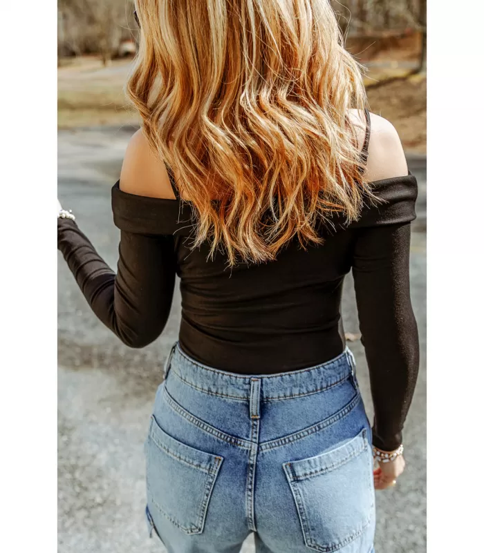 Musta pitkähihainen olkapäät paljastava body kurkistusaukolla. Sopii parhaiten n. 165-senttisille.