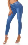 Siniset korkeavyötäröiset strassilahkeiset farkut takapuolta korostavalla leikkauksella. Farkuissa ei ole toppauksia.