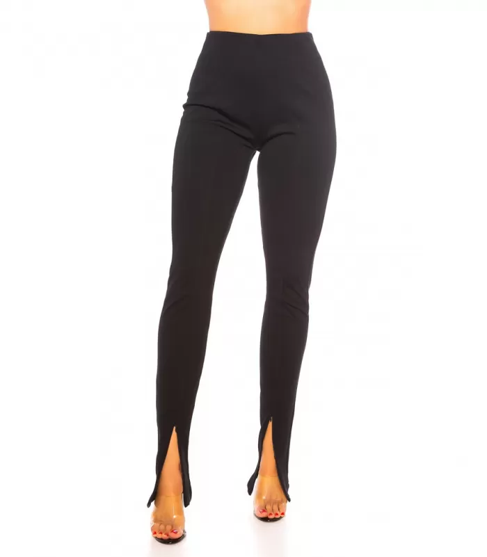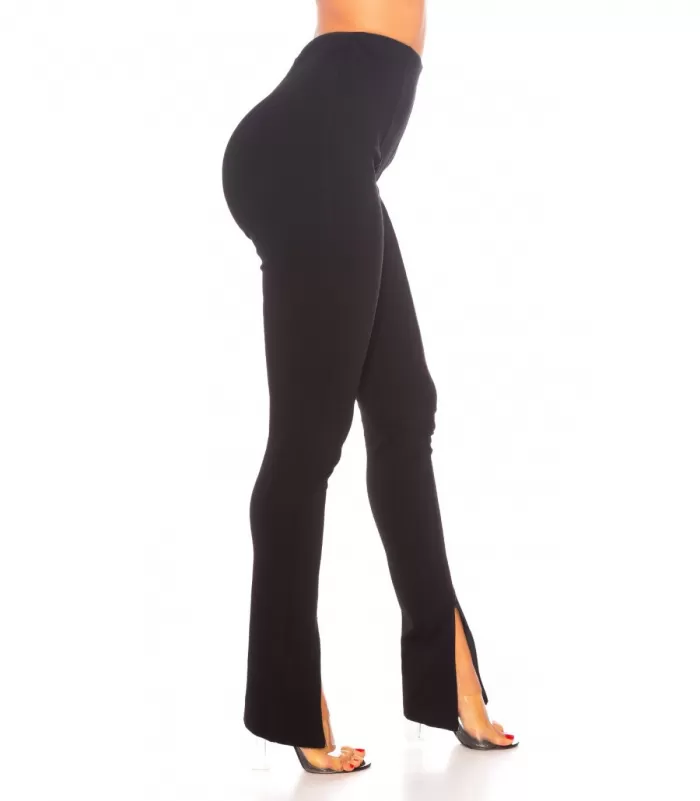 Mustat korkeavyötäröiset pitkälahkeiset housut halkiolahkeilla. Sopii kuvan mukaisesti "ylimittaisina" noin 165-senttisille ja lantioon nähden kapeavyötäröisille.