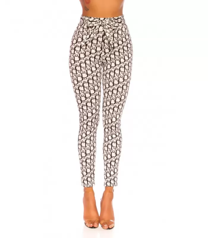 Valkomustat korkeavyötäröiset printtikuvioiset housut vyöllä. Sopii parhaiten lantioon nähden kapeavyötäröisille. Sopii täysimittaisina parhaiten noin 165-senttisille.