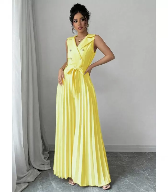 Elegantti keltainen jumpsuit napeilla ja vekkilahkeilla - Tyylikäs haalariasu eri tilanteisiin