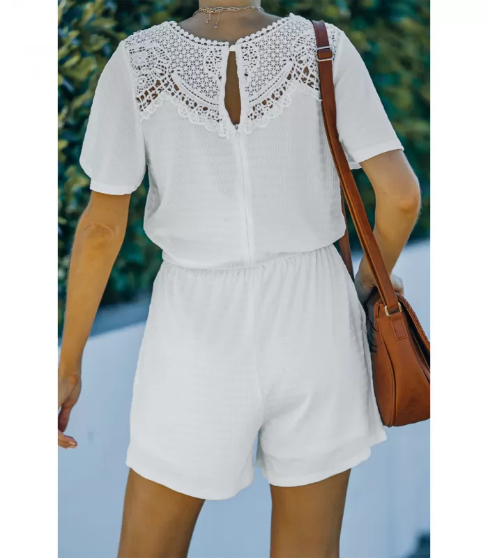 Valkoinen lyhythihainen koristekirjailtu shortsihaalari. Playsuit sopii parhaiten n. 165-senttisille.