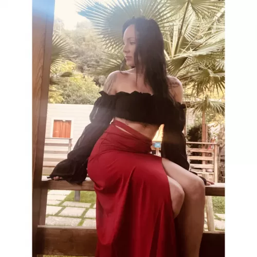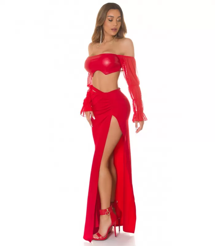 Upea korkeavyötäröinen punainen pitkä hame näyttävillä yksityiskohdilla. Säären paljastava korkea halkio ja vyötärön nauhayksityiskohta lisäävät seksikkyyttä pitkään hameeseen. Näyttävä vyötärö pääsee parhaiten oikeuksiinsa lyhyen yläosan kanssa. Halkion liehus tuo näyttävyyttä ja peittävyyttä ylös nousevaan halkioon. Kevyt hame on pitkästä pituudesta huolimatta miellyttävä päällä myös lämpimillä kesäkeleillä halkionsa ansiosta.