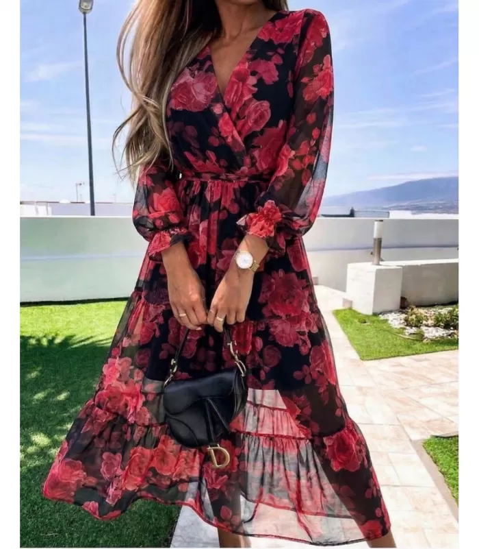 Upea mustapunainen pitkähihainen kukkakuvioinen sifonkimekko v-pääntiellä ja vyönauhalla. Naisellinen leikkaus ja kaunis ruusukuosi ovat ihastuttava yhdistelmä, jossa erotut massasta eduksesi. Läpikuultavat kevyet pussihihat ja pitkä sifonkihelma. Alla lyhyempi alusmekko. Täydellinen vaatevalinta moniin eri tilanteisiin, kun haluat pukeutua naisellisesti.