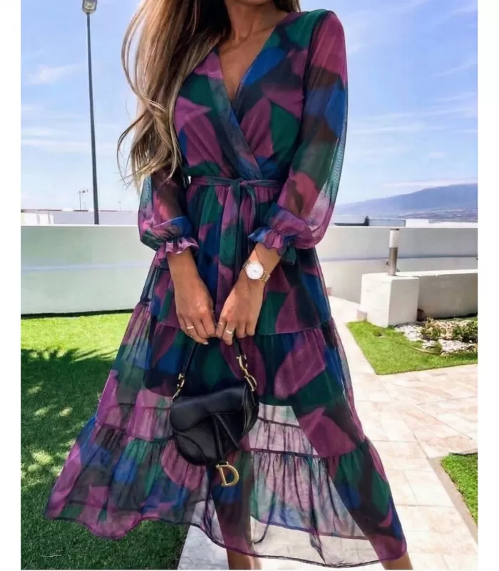 Upea värikäs pitkähihainen sifonkimekko v-pääntiellä ja vyönauhalla. Naisellinen leikkaus ja kaunis väritys ovat ihastuttava yhdistelmä, jossa erotut massasta eduksesi. Läpikuultavat kevyet pussihihat ja pitkä sifonkihelma. Alla lyhyempi alusmekko. Täydellinen vaatevalinta moniin eri tilanteisiin, kun haluat pukeutua naisellisesti.