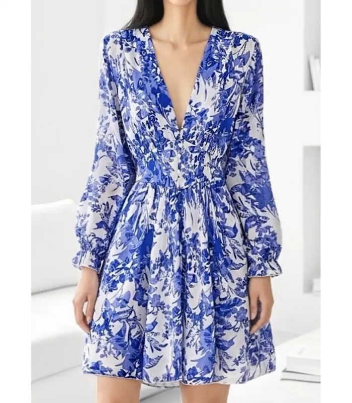 Upea sinivalkoinen pitkähihainen kukkakuvioinen mekko kauniilla yksityiskohdilla. Ihana pitkähihainen kukkamekko imartelee naisellisia muotojasi tyylikkäällä tavalla. Jos syvään uurrettu v-kaula-aukko tuntuu omaan tyyliisi liian avaralta, laita alle esimerkiksi pitsikoristeinen alustoppi. Kaunis kukallinen mekko sopii loistavasti juhliin ja siistimpää pukeutumista vaativiin tilaisuuksiin.