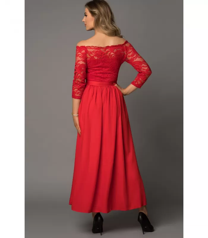 Punainen 3/4-hihainen pitsikoristeinen pitkä juhlamekko halkiolla. Kaunis pitkä off-shoulder juhlamekko pitsillä sopii täydellisesti eri juhliin. Sivulla piilovetoketju. Punainen off-shoulder maksimekko pitsihihoilla on tyylikäs valinta vuodesta toiseen.
