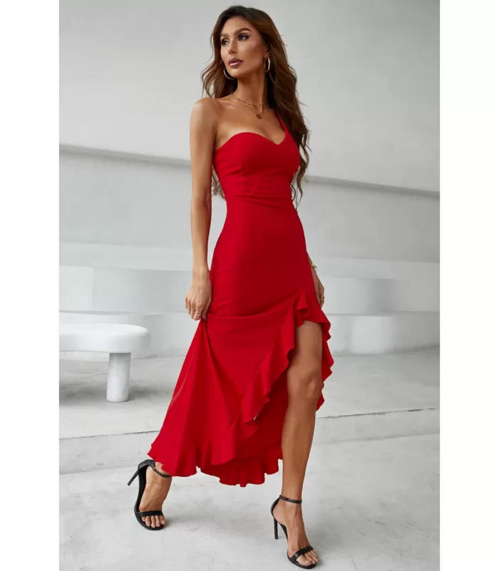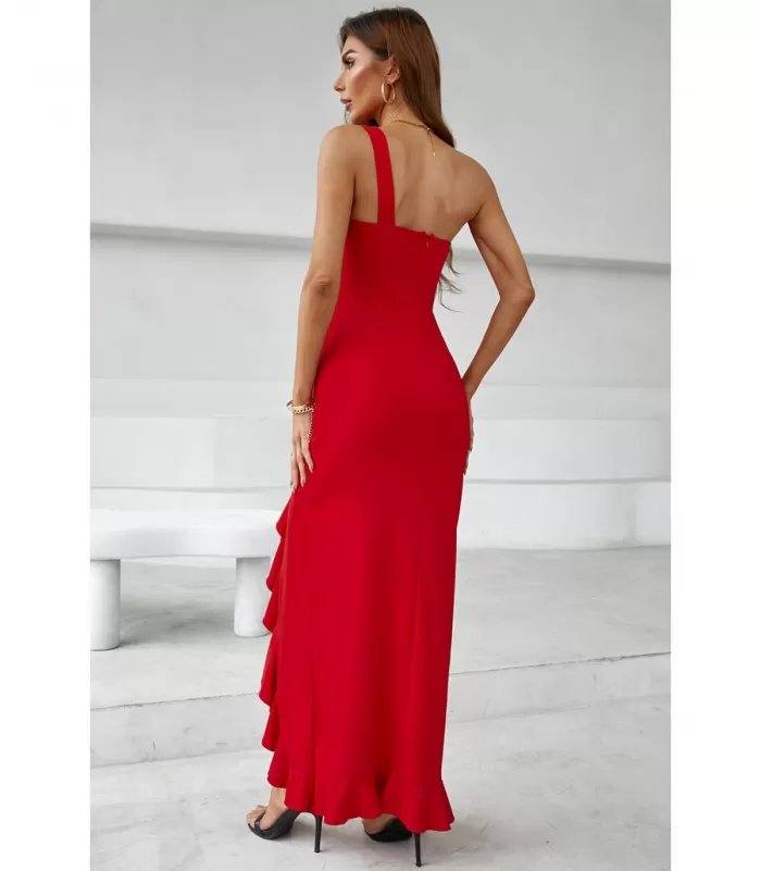 Punainen yksiolkaiminen pitkä juhlamekko halkiolla. Sopii parhaiten n. 165-senttisille.