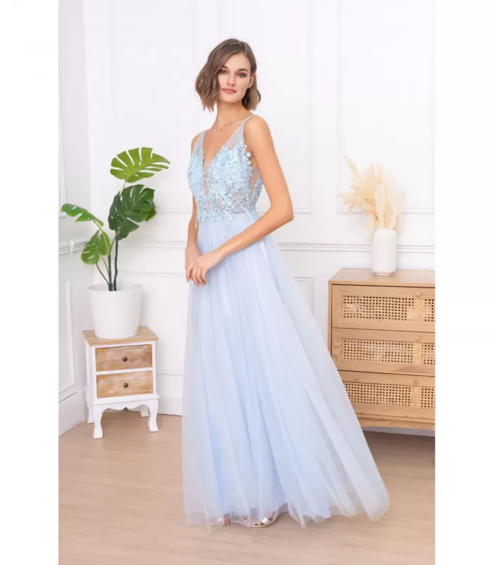 Vaaleansininen pitkä juhlamekko upeilla yksityiskohdilla. Pitkä prinsessamainen helma hennolla glitterillä yhdistettynä mesh-yläosaan, jossa paljetteja, siemenhelmiä ja kauniit koristekirjailut. Upea pitkä mekko juhliin sopii loistavasti moneen tärkeään juhlapäivään. Onpa haussasi edullinen vanhojentanssimekko, kaunis mekko kaasolle tai asu muihin elegantteihin juhliin, tämä on erinomainen valinta.