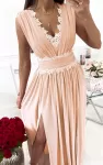 Vaaleanpunainen kaksiolkaiminen pitkä juhlamekko halkiolla ja koristeilla. Mekko ei juurikaan jousta, joten jos mietit kahden koon välillä, ota isompi koko. Sopii parhaiten alle 165-senttisille.