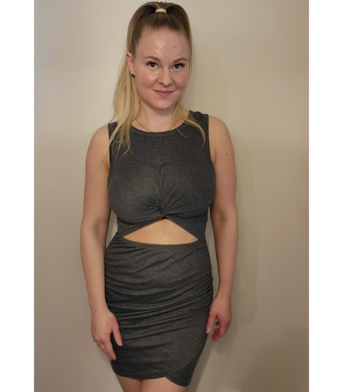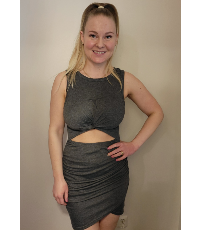 Hihaton tummanharmaa minimekko halkiolla ja wrap-look helmalla. Yksivärinen mekko näyttävällä solmuyksityiskohdalla ja vyötäröä edestä paljastavalla leikkauksella. Vartaloamyötäilevä ylävatsaa paljastava minimekko näyttää erityisen upealta tiimalasivartaloisilla. Kun haussasi on rento mekko, jossa voit esitellä upeaa vartaloasi tyylikkäällä tavalla, on tämä hihaton cut out -minimekko loistava valinta.