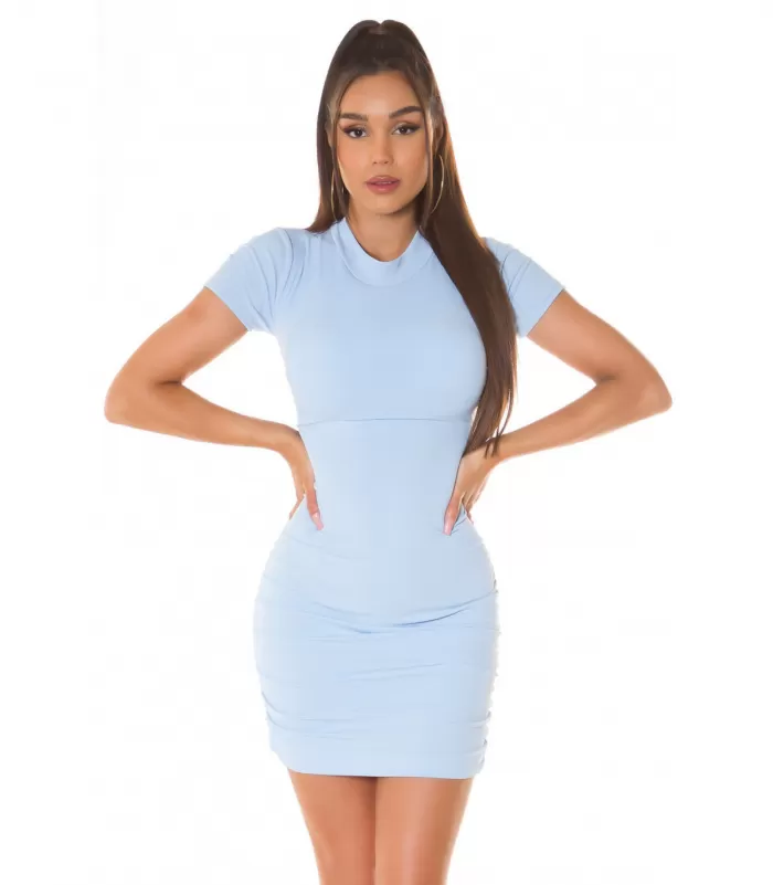 Vaaleansininen lyhythihainen nyöriselkäinen minimekko takapuolta korostavalla rypytyksellä. Mekossa on kevyesti topatut kupit, joten mekon alle ei tarvitse välttämättä liivejä.