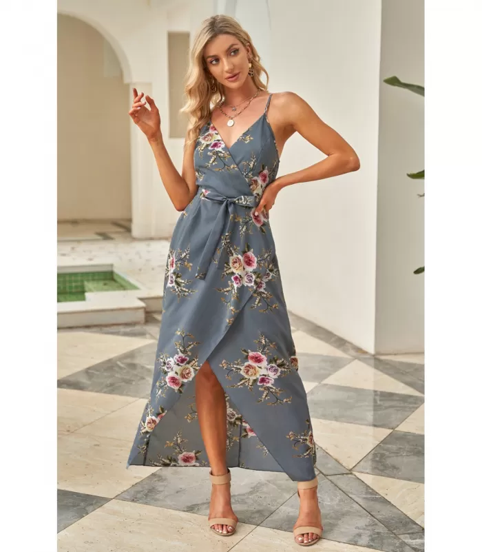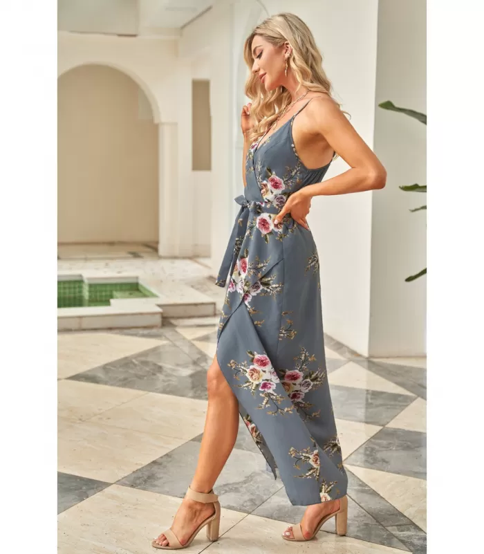 Harmaa kukkakuvioinen kaksiolkaiminen wrap-look v-maksimekko halkiolla. Sopii parhaiten n. 165-170-senttisille.