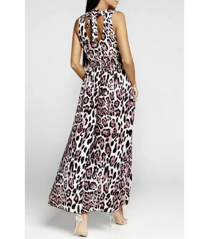 Leopardikuvioinen v-maksimekko yläselästä solmittavilla nauhoilla. Mekko ei juurikaan jousta. Mekko sopii parhaiten noin 165-senttisille.