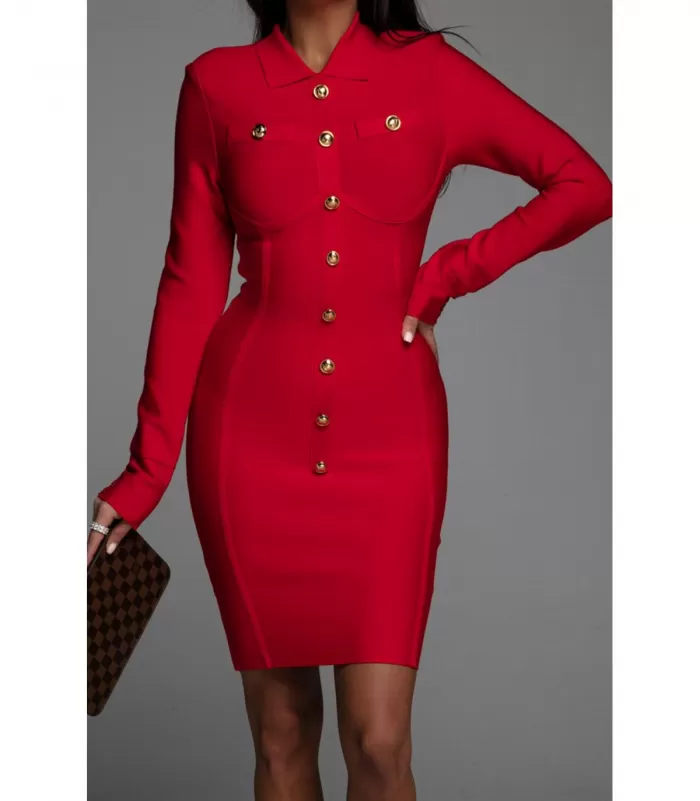 Punainen pitkähihainen nappikoristeinen mekko kauluksilla. Selässä joustava vyötärökuminauha. Valmistettu Euroopassa.