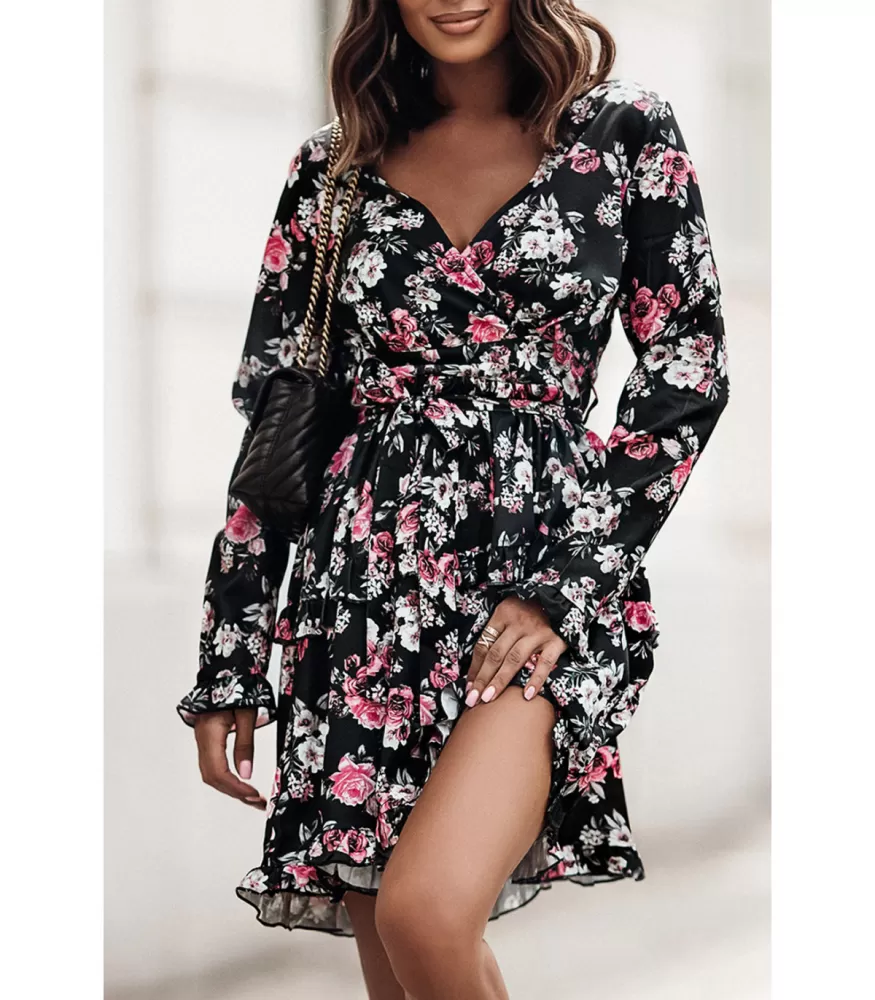 Musta kukkakuvioinen pitkähihainen v-mekko röyhelöillä ja vyöllä. Kukkakuvioinen röyhelömekko on erittäin naisellinen vaate. Jos naisellinen tyyli on sun juttu, tämä pitkähihainen kukkamekko v-pääntiellä on täydellinen vaate sinulle. Kukkakuosi ja röyhelöt ovat hurmaavia yksityiskohtia, jotka lumoavat. Jos v-kaula-aukko tuntuu omaan makuun liian avaralta, laita alle alustoppi. Vyötärölle solmittava vyö tuo vyötäröä esiin. Jos kaipaat vaihtelua tai haluat korostaa vyötäröä vielä enemmän, kokeile vyötärölle leveämpää vyötärövyötä.