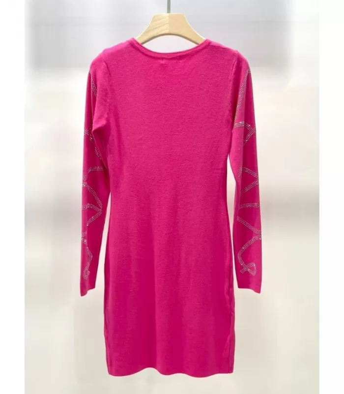 Pinkki pitkähihainen strassikoristeinen neulemekko. Tämä on sinua varten, joka kaipaat pukeutumiseesi säihkettä mutta palelet helposti. Erinomainen valinta erityisesti talvikauden iltamenoihin. Säihky ja erotu eduksesi.