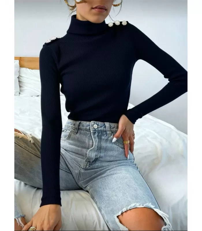 Kuka sanoi, että pooloneule on tylsä? Tämä korkeakauluksinen musta neule on peittävyydestään huolimatta näyttävä. Hienot strassinapit olkapäillä tuovat näyttävyyttä muuten yksinkertaiseen vaatteeseen. Monikäyttöinen ribbineule on helppo stailata osaksi erilaisia tyylejä ja asukokonaisuuksia.