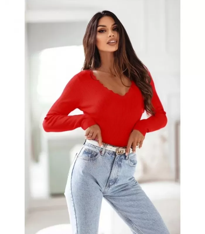 Punainen pitkähihainen neule aaltoilevalla v-pääntiellä. Tämä basic ribbineule on ajaton vaatekappale, joka on helppo yhdistää eri vaatteiden kanssa vuodesta toiseen. Naisellinen kaula-aukko tuo näyttävyyttä muuten yksinkertaiseen vaatteeseen. Punainen neulepaita erottuu edukseen.