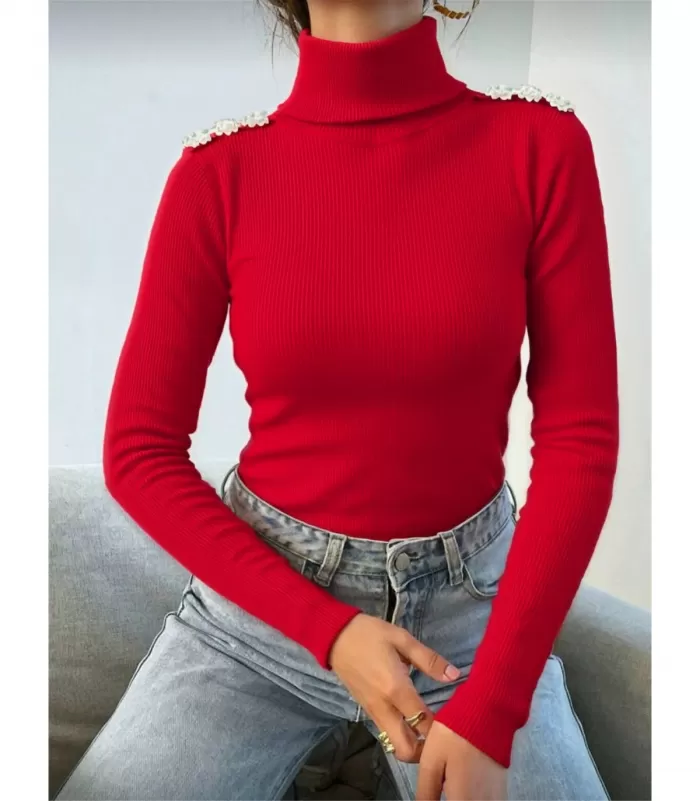 Kuka sanoi, että pooloneule on tylsä? Tämä korkeakauluksinen punainen neule on peittävyydestään huolimatta näyttävä. Hienot strassinapit olkapäillä tuovat näyttävyyttä muuten yksinkertaiseen vaatteeseen. Monikäyttöinen ribbineule on helppo stailata osaksi erilaisia tyylejä ja asukokonaisuuksia.