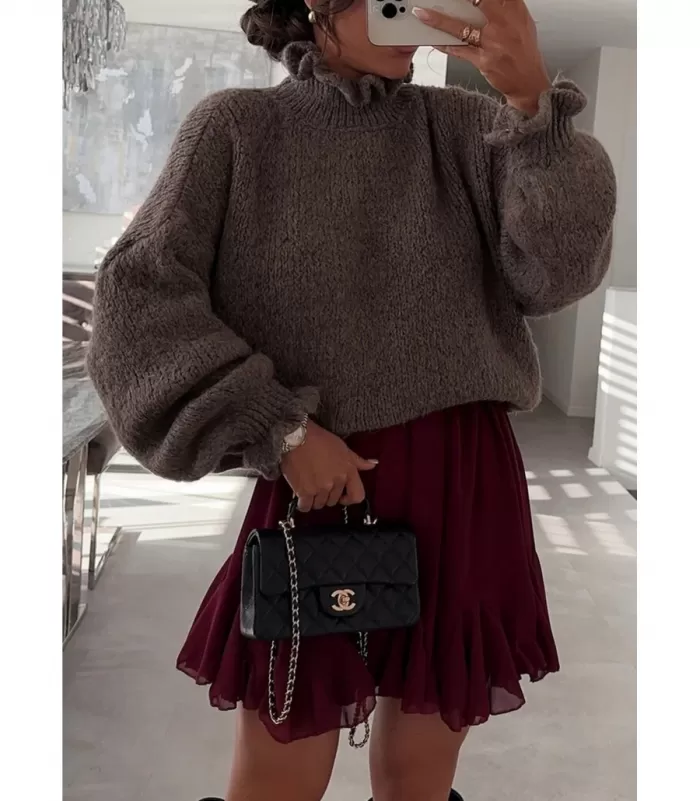 Ihastuttava naisten ruskea neulepaita, joka sekä näyttää kauniilta että tuntuu mukavalta päällä. Pehmeä materiaali on miellyttävä ja pitää sinut lämpimänä myös kylminä pakkaspäivinä. Rento väljä malli, naiselliset pussihihat ja korkea kaulus ovat yhdistelmä, joka sopii täydellisesti moneen eri tilanteeseen. Yhdistä farkkujen kanssa tai stailaa lämmin mutta naisellinen asukokonaisuus hameen kanssa.