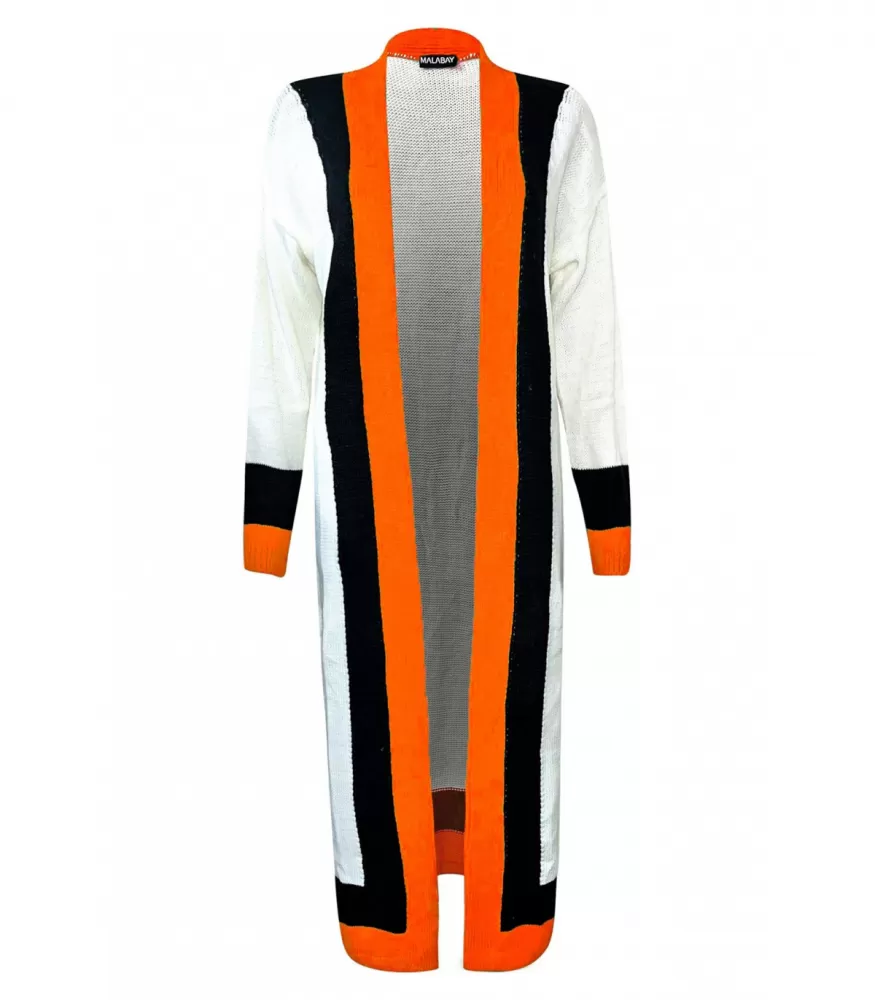 Pitkä kolmevärinen avonainen neuletakki oransseilla tehosteilla. Valmistettu Euroopassa.