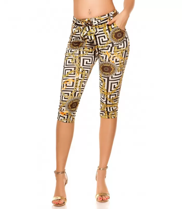 Ketjuprinttikuvioiset caprimittaiset treggingsit vyöllä. Sopii parhaiten lantioon nähden kapeavyötäröisille.