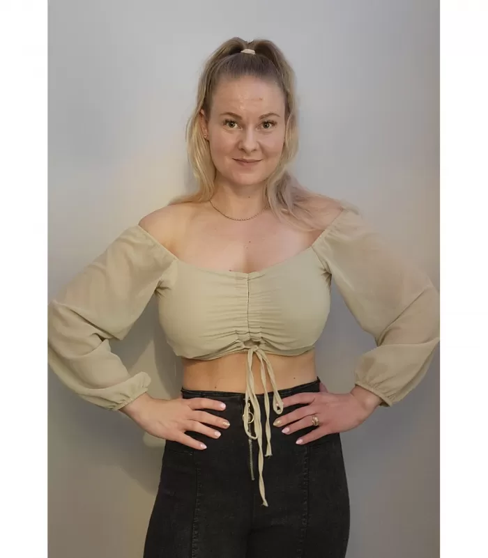 Beige pitkähihainen off-shoulder latinapaita rypytyksillä ja halkioilla. Läpinäkyvät pussihihat ja selkämys. Valmistettu Euroopassa. Naisellinen latinapaita on täydellinen vaatevalinta treffeille ja viihteelle. Yhdistä pitkähihainen lyhyt paita korkeavyötäröisten housujen tai hameen kanssa.
