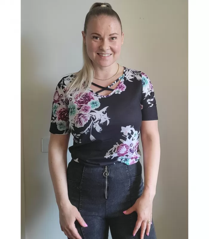 Lyhythihainen väljä musta kukkakuvioinen paita ristikkokoristeella. Edullinen musta kukkapaita ristikolla on ihana kesäpaita, joka sopii osaksi monenlaista eri tyyliä; se sopii loistavasti käyttöön sekä housujen, hameiden kuin shortsienkin kanssa. Kukallinen lyhythihainen t-paita on täydellinen kesään, mutta esimerkiksi neuletakin kanssa voit tuoda tyyliisi kesäistä tuulahdusta ympäri vuoden. Kaunis kukkakuosi on aina in, joten tämä ajaton vaate on erinomainen täydennys vaatekaappiin. Kaunis kukkapaita sopii loistavasti sekä nuorille että varttuneemmille naisille. Kun haussasi on imarteleva aikuisen naisen paita, tämä onkin loistava vaihtoehto.